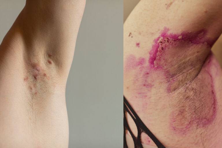 These boil-like nodules occur in sweaty, friction-prone areas like the armpits, between the legs and buttocks, the groin area, and under the breasts. These recurring lumps hurt, take a long time to heal, and often cause fibrous scarring and tunnels under the skin.